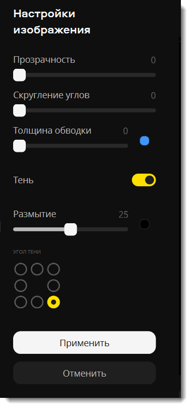 Измените другие настройки, если нужно. Поправьте ползунки Прозрачность и Толщина обводки. Добавьте тень, отрегулируйте ее цвет, угол и размытие.