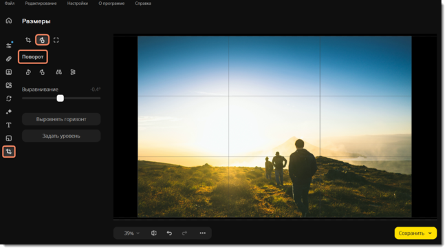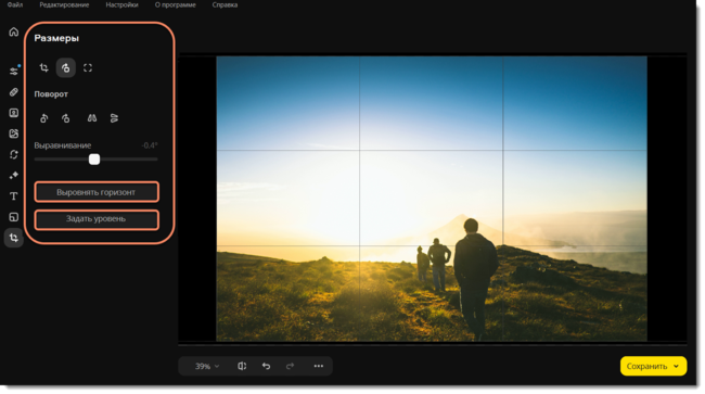 Нажмите на кнопку Выровнять горизонт, чтобы выровнять горизонт на фотографии автоматически.