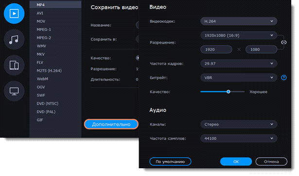 3. Чтобы открыть окно дополнительных настроек видео, нажмите Дополнительно в окне сохранения.