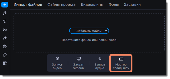 На вкладке Импорт в разделе Импорт файлов выберите Мастер слайд-шоу