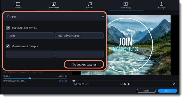 Чтобы задать клипам другой порядок их появления в видео, нажмите Перемешать.
