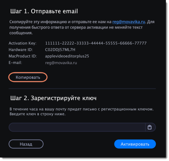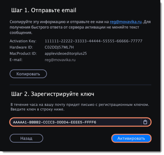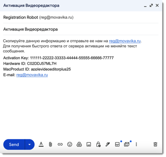 5. Когда у вас будет доступ в интернет, вставьте эту информацию в текст письма и отправьте его по e-mail на reg@movavika.ru. В течение часа вам должен прийти ответ с вашим регистрационным ключом. Скопируйте ключ и перенесите его на компьютер с Мовавика Видео.