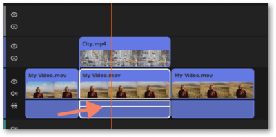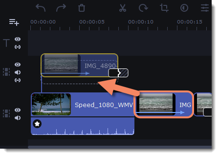 Разместите клип относительно других клипов и шкалы времени. Между наложенным клипом и основным клипом появится соединяющая голубая полоса. Эта полоса означает, что дополнительный клип привязан к основному: при перемещении, нарезке или удалении основного клипа, наложенный клип также будет перемещен, разрезан или удален. При перемещении клипа на дорожку дополнительного видео, откроется панель редактирования. Если вы переключились на другой инструмент, то вернуться к панели редактирования наложения можно на вкладке Другие инструменты – Видео – Расположение.
