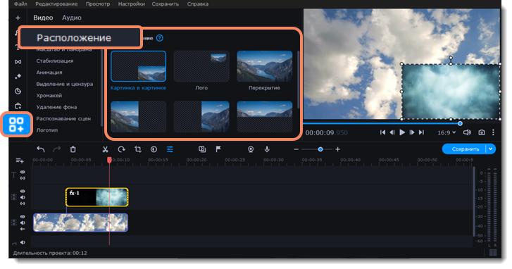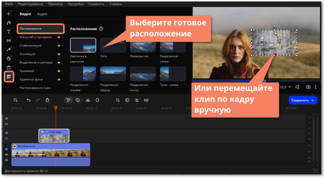 2. Если нужно, переместите наложенное видео в кадре на нужное место с помощью инструмента Расположение.