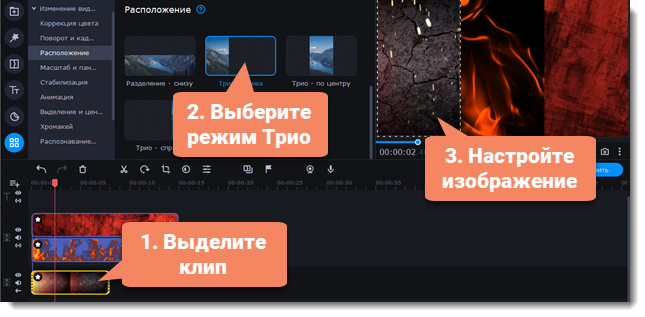 Выделите клип на дорожке дополнительного видео и выберите один из режимов «Трио».