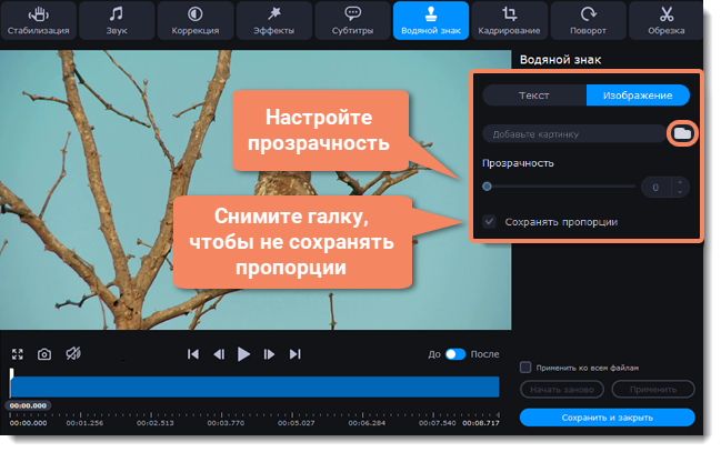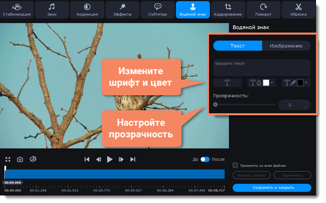 С помощью инструмента Водяной знак вы можете наложить текст или картинку на любое видео или изображение.