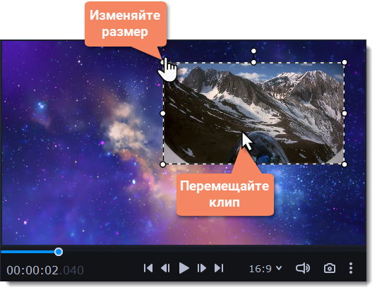 2. В плеере, перетащите наложенный клип на нужное место в кадре.