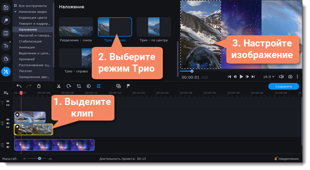 На панели инструмента выберите режим наложения дополнительного видео: Картинка в картинке, Лого, Перекрытие, Разделение, Трио.
