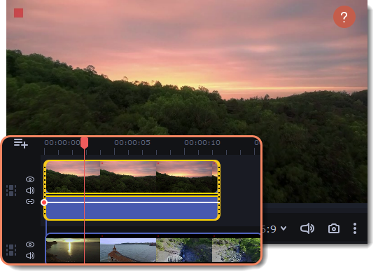 3. Чтобы изменить размер наложенного клипа, потяните мышью за углы рамки. Пропорции клипа будут сохранены.