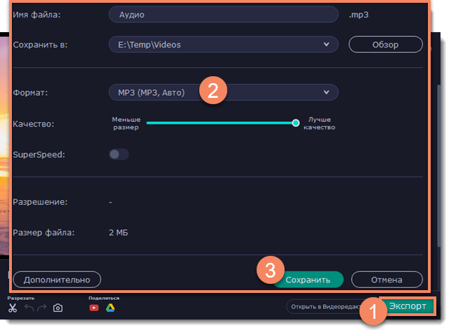 Запись готова и сохранена в формате MP3. Вы можете её проиграть, обрезать или сменить формат.