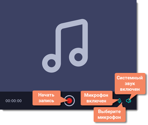 Для записи музыки, онлайн-видео или любых других звуков, которые вы обычно слышите через колонки, нажмите кнопку Системный звук.