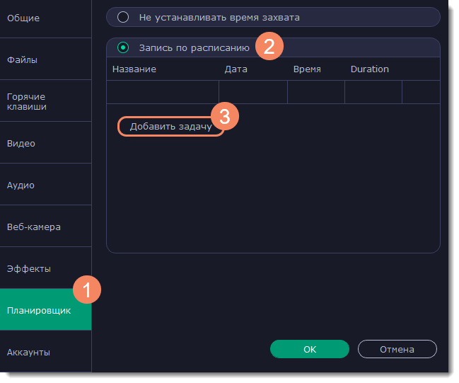 Записи по расписанию используют текущие установленные настройки области захвата, звука и другие, поэтому рекомендуем их настроить заранее: