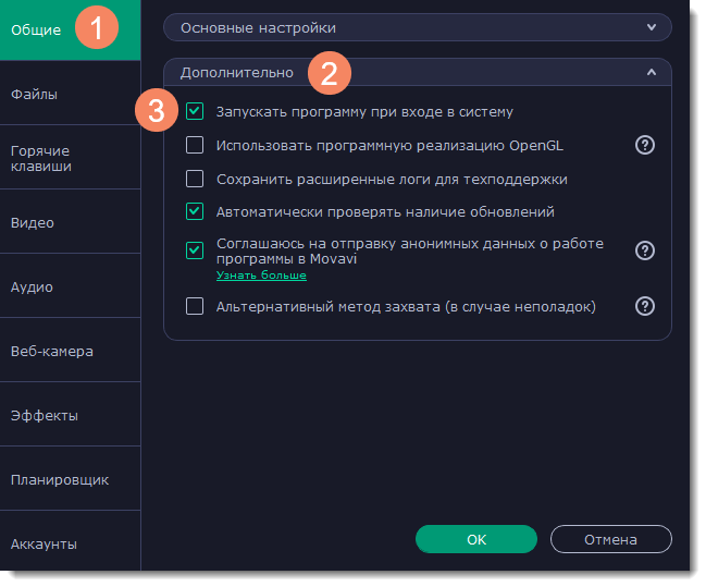 Чтобы запись по расписанию сработала, компьютер и программа захвата экрана должны работать в это время. Если вы установили запись на другой день, вы можете включить автоматический запуск программы захвата, чтобы не пропустить запись. Для этого откройте вкладку Общие в параметрах, нажмите Дополнительно и включите опцию Запускать программу при входе в систему.