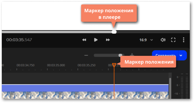 Текущее положение в проекте указывается маркером положения в плеере либо маркером с оранжевой полосой на таймлайне.