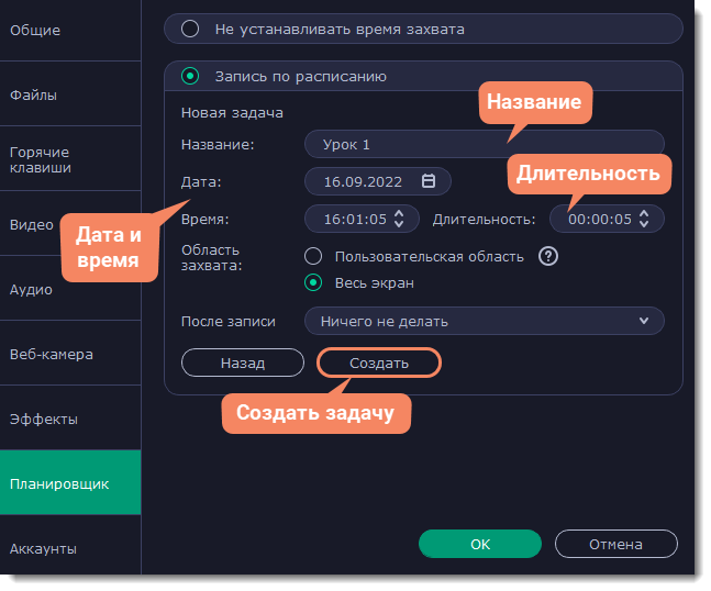 В разделе Планировщик вы можете настроить автоматическое начало и завершение записи.