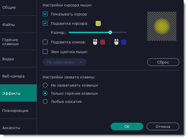 В разделе Эффекты вы можете настроить видимость курсора и нажатий клавиш на видео.