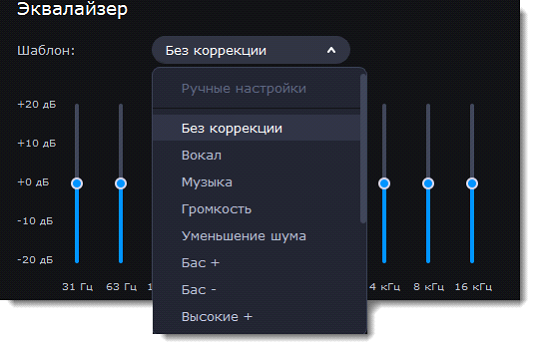 Вы можете сохранить собственный шаблон значений эквалайзера. Установите ползунки на необходимые уровни и нажмите Сохранить. В открывшемся окне введите название шаблона и нажмите ОК. Созданный шаблон появится в списке предустановок.