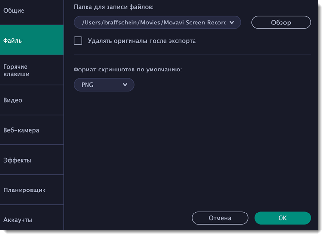 В разделе Файлы вы можете настроить, где хранить создаваемые Movavi Screen Recorder файлы: готовые видео, снимки экрана и временные файлы. Нажмите кнопку со стрелкой или кнопку Обзор, чтобы поменять путь.