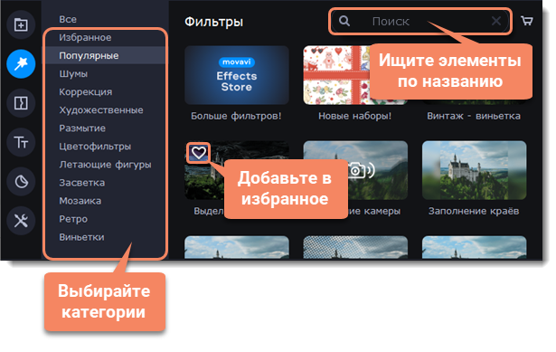 4. Выберите понравившийся фильтр и перетащите его на клип, чтобы применить. Клип с примененным эффектом будет обозначен звездочкой.