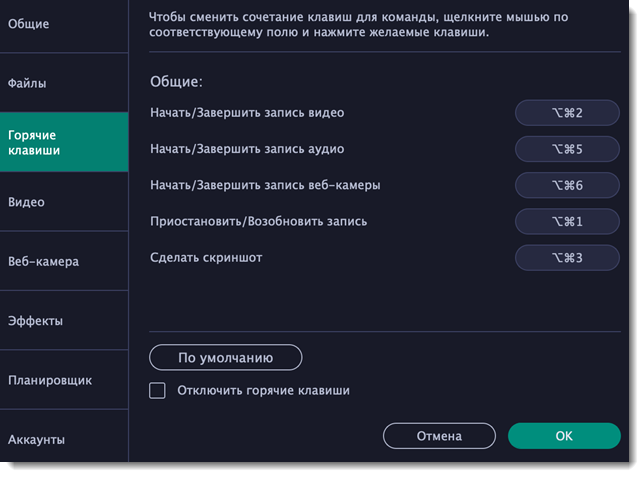 Если во время работы Movavi Screen Recorder вам понадобится использовать какое-то сочетание клавиш в других программах, поставьте галочку напротив опции