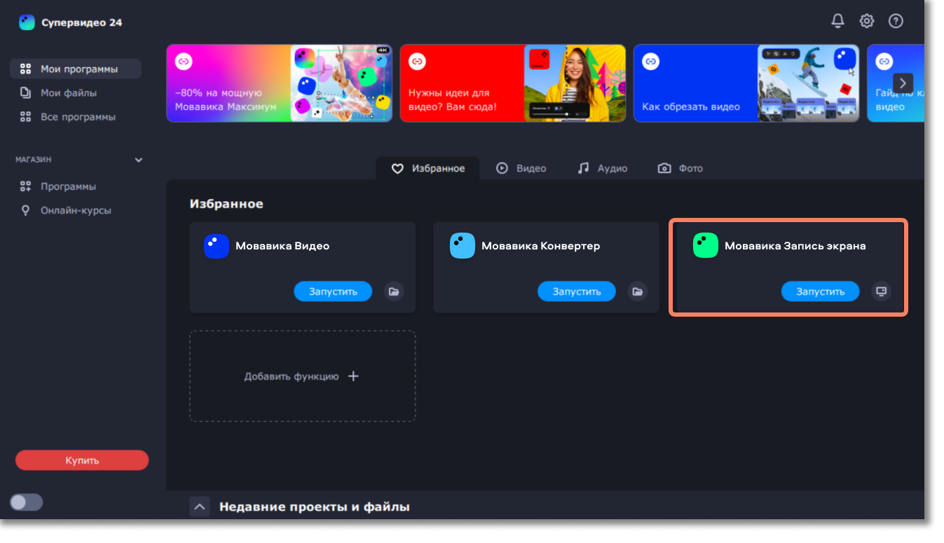 • Откройте программу запуска Мовавика Супервидео и перейдите на вкладку Видео.