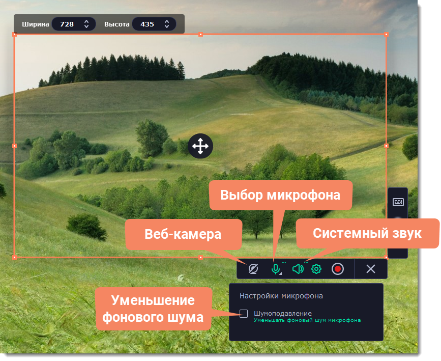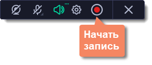 По умолчанию включена только запись системного звука (музыки и звуков с компьютера). Чтобы включить запись веб-камеры или микрофона, нажмите соответствующие иконки:
