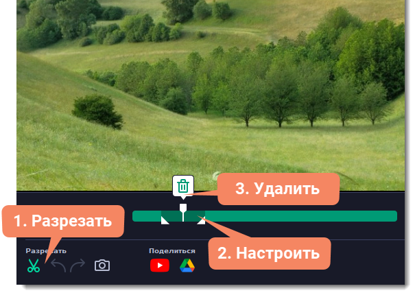 1. Разместите ползунок прокрутки в область ненужного фрагмента и нажмите кнопку со значком ножниц.