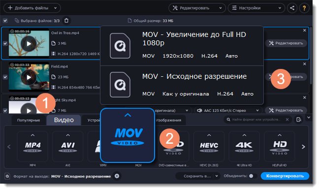 Разрешение видео — это количество пикселей в каждом кадре. Более высокое разрешение позволяет сохранить больше информации и обеспечивает высокое качество, но также делает больше размер файла. Выберите разрешение немного ниже, если размер видео слишком большой. Например, вы можете сконвертировать файл с разрешением 1080p в 720p.