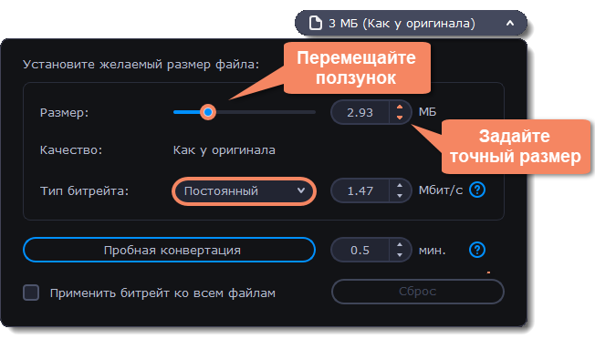 2. Нажмите на размер файла, чтобы открыть окно настройки размера. В нем выберите тип битрейта.