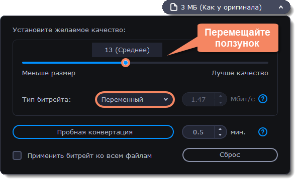 Переменный битрейт (VBR) позволяет уменьшить размер выходного файла в 2-3 раза, сохраняя качество, но предсказать его точный размер невозможно. В процессе кодирования с переменным битрейтом количество битов в секунду будет динамически увеличиваться или уменьшаться в зависимости от потребностей битрейта медиафайлов.  Рекомендуется всегда использовать VBR за исключением случаев, когда файл будет воспроизводиться на устройстве, поддерживающем только CBR.