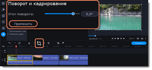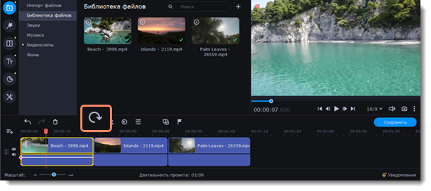 2. Нажмите на кнопку Поворот на панели инструментов, чтобы повернуть клип. Нажмите снова, чтобы повернуть клип еще раз.