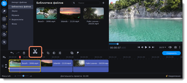 Разрезать видео на части и удалить фрагменты легко с помощью инструмента нарезки. Инструмент нарезки находится на панели инструментов главного окна и помечен значком ножниц.