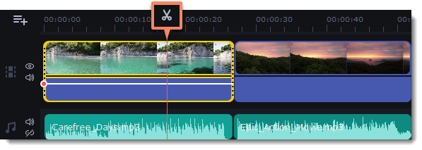 2. Нажмите кнопку Разрезать. Клип будет разрезан на две части, в то время как ненужный фрагмент станет началом второго клипа.